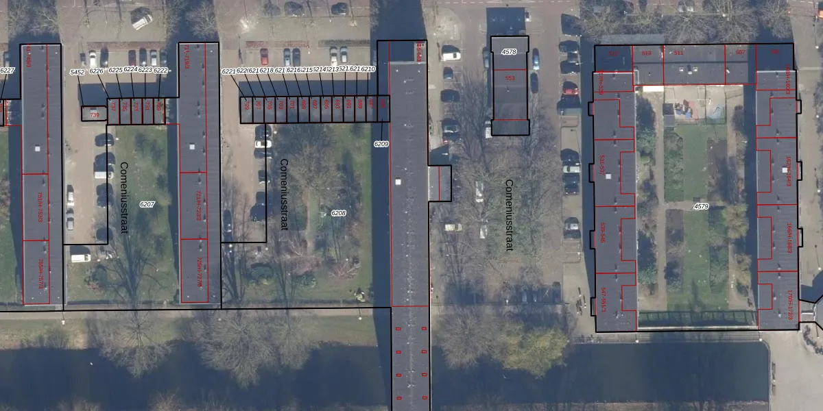 Het perceel waarop Comeniusstraat 671 staat heeft een oppervlakte van 2547 m². Dit is een zeer groot perceel. De perceeloppervlakte wordt geregistreerd door het Kadaster. Gedetailleerde informatie over de maten van dit perceel kunt u vinden in het rapport Kadastrale kaart met maatvoering van Comeniusstraat 671.