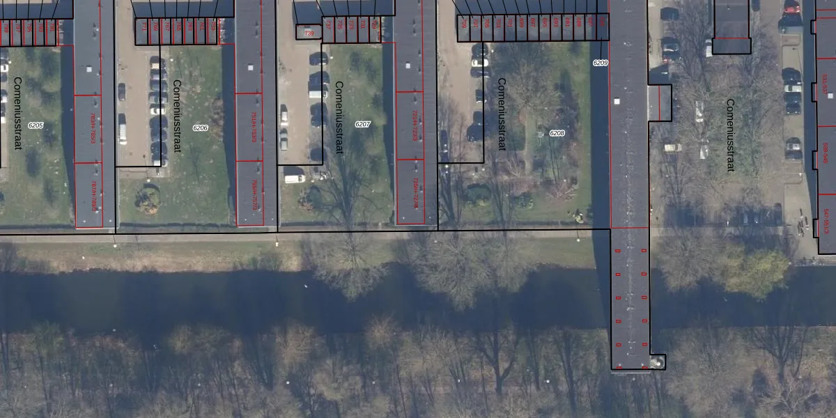 Het perceel waarop Comeniusstraat 727-1 staat heeft een oppervlakte van 1630 m². Dit is een zeer groot perceel. De perceeloppervlakte wordt geregistreerd door het Kadaster. Gedetailleerde informatie over de maten van dit perceel kunt u vinden in het rapport Kadastrale kaart met maatvoering van Comeniusstraat 727-1.
