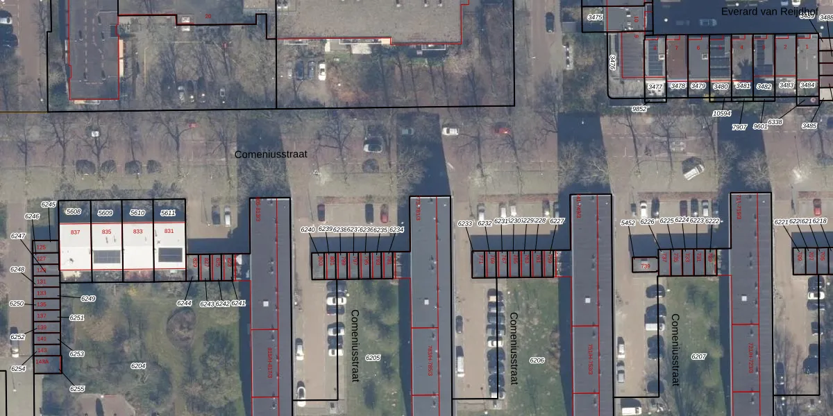 Het perceel waarop Comeniusstraat 773 staat heeft een oppervlakte van 1637 m². Dit is een zeer groot perceel. De perceeloppervlakte wordt geregistreerd door het Kadaster. Gedetailleerde informatie over de maten van dit perceel kunt u vinden in het rapport Kadastrale kaart met maatvoering van Comeniusstraat 773.