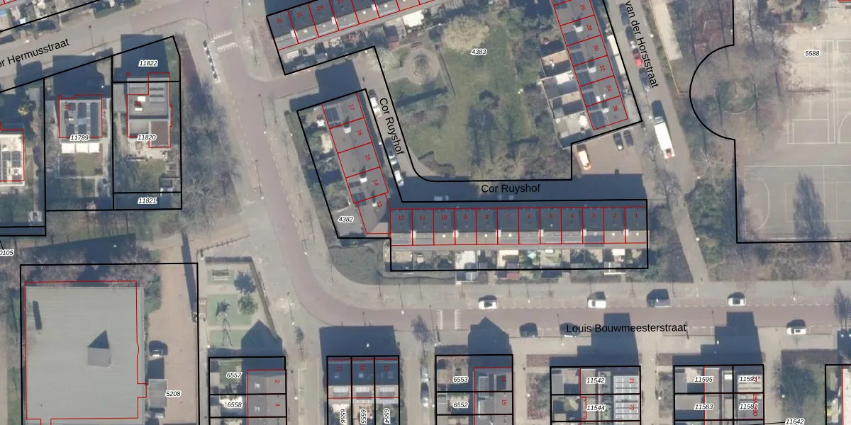 Het perceel waarop Cor Ruyshof 11 staat heeft een oppervlakte van 1523 m². Dit is een zeer groot perceel. De perceeloppervlakte wordt geregistreerd door het Kadaster. Gedetailleerde informatie over de maten van dit perceel kunt u vinden in het rapport Kadastrale kaart met maatvoering van Cor Ruyshof 11.
