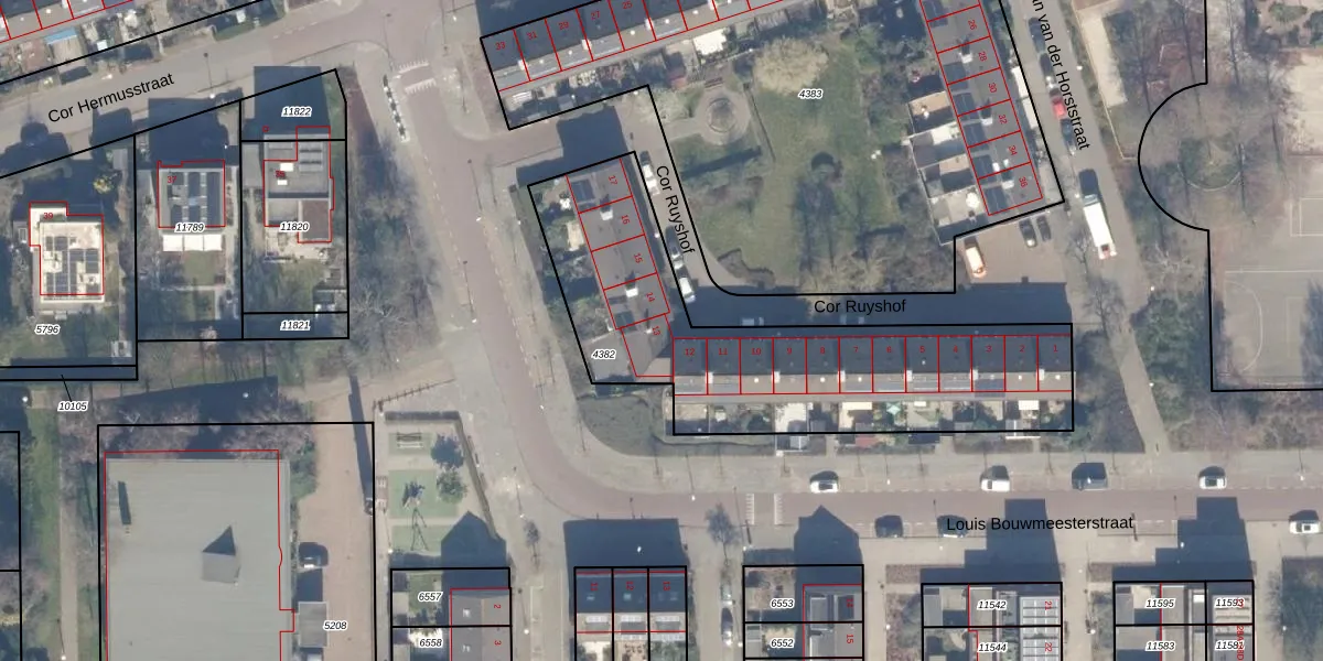 Het perceel waarop Cor Ruyshof 13 staat heeft een oppervlakte van 1523 m². Dit is een zeer groot perceel. De perceeloppervlakte wordt geregistreerd door het Kadaster. Gedetailleerde informatie over de maten van dit perceel kunt u vinden in het rapport Kadastrale kaart met maatvoering van Cor Ruyshof 13.