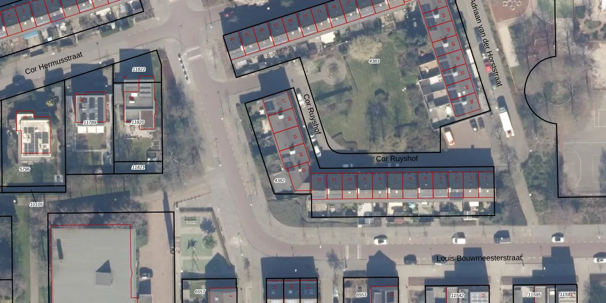 Het perceel waarop Cor Ruyshof 14 staat heeft een oppervlakte van 1523 m². Dit is een zeer groot perceel. De perceeloppervlakte wordt geregistreerd door het Kadaster. Gedetailleerde informatie over de maten van dit perceel kunt u vinden in het rapport Kadastrale kaart met maatvoering van Cor Ruyshof 14.