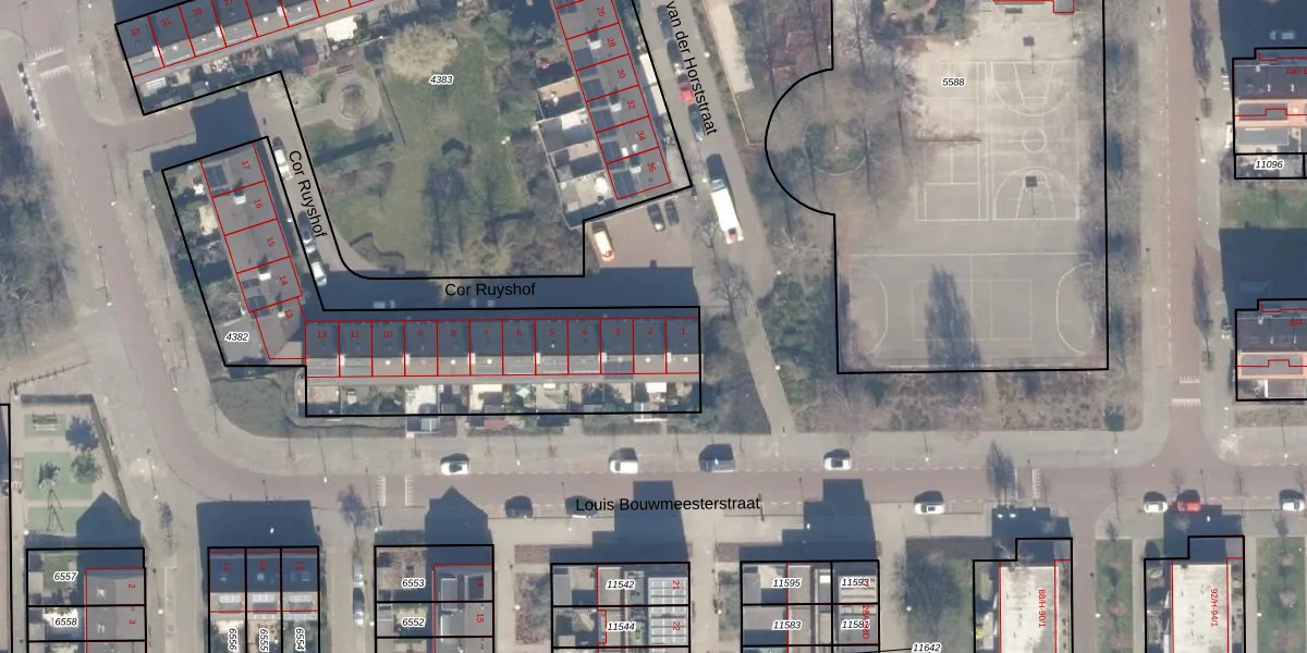 Het perceel waarop Cor Ruyshof 2 staat heeft een oppervlakte van 1523 m². Dit is een zeer groot perceel. De perceeloppervlakte wordt geregistreerd door het Kadaster. Gedetailleerde informatie over de maten van dit perceel kunt u vinden in het rapport Kadastrale kaart met maatvoering van Cor Ruyshof 2.