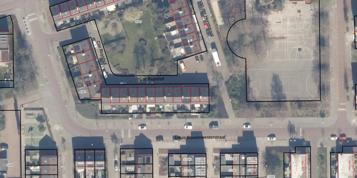 Het perceel waarop Cor Ruyshof 4 staat heeft een oppervlakte van 1523 m². Dit is een zeer groot perceel. De perceeloppervlakte wordt geregistreerd door het Kadaster. Gedetailleerde informatie over de maten van dit perceel kunt u vinden in het rapport Kadastrale kaart met maatvoering van Cor Ruyshof 4.