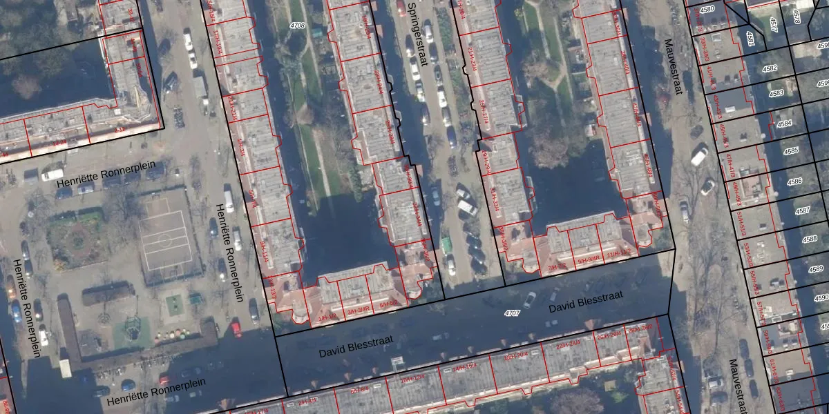 Het perceel waarop het adres ligt is ASD18-V-4708. De afkorting 'ASD18' staat voor kadastrale gemeente Amsterdam. De oppervlakte van het perceel is 5550 m². Dat is groter dan gemiddeld in Amsterdam, waar de gemiddelde perceeloppervlakte op 558,8 m² ligt. Het kleinste perceel in de kadastrale gemeente is 0 m² groot. De grootste perceeloppervlakte is 12,5 ha. Op het perceel zijn 162 adressen aanwezig. In de Basisregistratie Kadaster (BRK) werden de grenzen van het perceel geregistreerd op 09-08-2006.