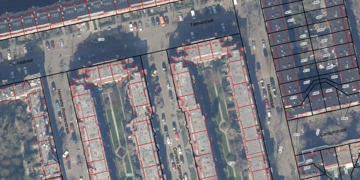 Het perceel waarop het adres ligt is ASD18-V-4710. De afkorting 'ASD18' staat voor kadastrale gemeente Amsterdam. De oppervlakte van het perceel is 5550 m². Dat is groter dan gemiddeld in Amsterdam, waar de gemiddelde perceeloppervlakte op 558,8 m² ligt. Het grootste perceel in de kadastrale gemeente is 12,5 ha. Het kleinste perceel heeft een oppervlakte van 0 m². Op het perceel liggen in totaal 162 adressen. De huidige grenzen van het perceel zijn digitaal in de Basisregistratie Kadaster (BRK) geregistreerd op 09-08-2006.