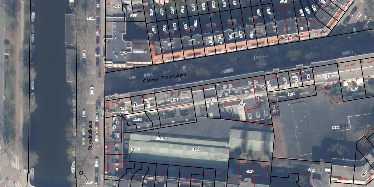 Het perceel waarop het adres ligt is ASD18-V-9393. De afkorting 'ASD18' staat voor kadastrale gemeente Amsterdam. Het perceel is 369 m² groot. Dat is kleiner dan de gemiddelde perceeloppervlakte in Amsterdam, dat op 558,8 m² ligt. Het grootste perceel in de kadastrale gemeente is 12,5 ha. Het kleinste perceel heeft een oppervlakte van 0 m². Er zijn 12 adressen aanwezig op het perceel. De laatste wijziging in het de Basisregistratie Kadaster (BRK) was op 20-09-2006.