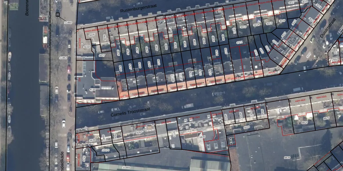 Het perceel waarop het adres ligt is ASD18-V-11186. De afkorting 'ASD18' staat voor kadastrale gemeente Amsterdam. Het perceel is 128 m² groot. Dat is kleiner dan de gemiddelde perceeloppervlakte in Amsterdam, dat op 558,8 m² ligt. Het grootste perceel in de kadastrale gemeente is 12,5 ha. Het kleinste perceel heeft een oppervlakte van 0 m². Op het perceel zijn 4 adressen aanwezig. In de Basisregistratie Kadaster (BRK) werden de grenzen van het perceel geregistreerd op 20-09-2006.