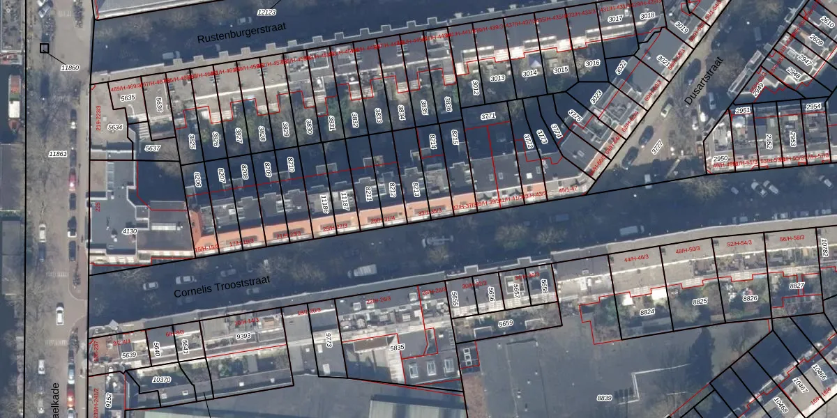 Het perceel waarop het adres ligt is ASD18-V-8213. De afkorting 'ASD18' staat voor kadastrale gemeente Amsterdam. Het perceel is 128 m² groot. Dat is kleiner dan de gemiddelde perceeloppervlakte in Amsterdam, dat op 558,8 m² ligt. Het grootste perceel in de kadastrale gemeente is 12,5 ha. Het kleinste perceel heeft een oppervlakte van 0 m². Op het perceel zijn 4 adressen aanwezig. De laatste wijziging in het de Basisregistratie Kadaster (BRK) was op 20-09-2006.