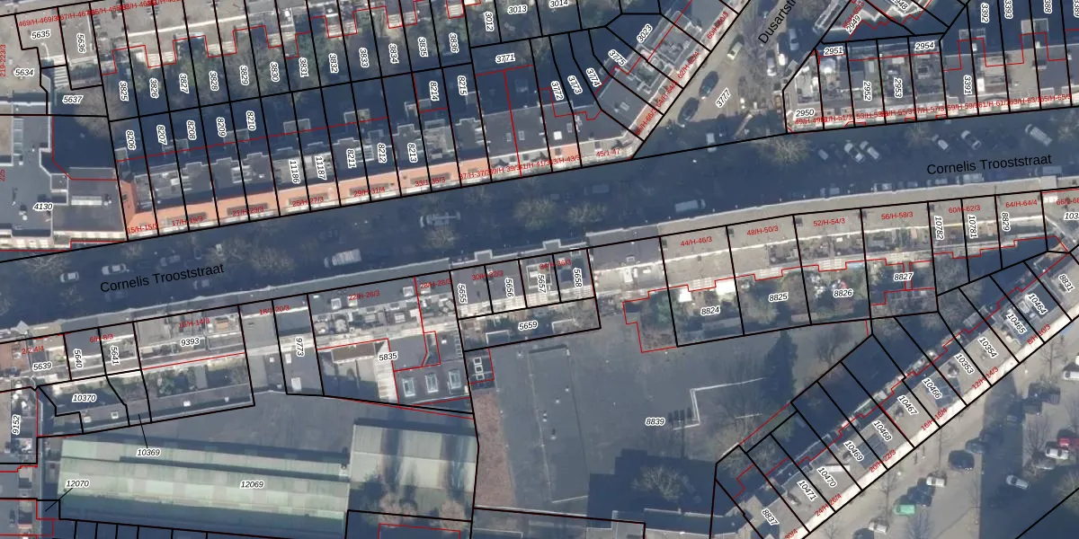 Het perceel waarop Cornelis Trooststraat 34-H staat heeft een oppervlakte van 59 m². Dit is een klein perceel. De perceeloppervlakte wordt geregistreerd door het Kadaster. Gedetailleerde informatie over de maten van dit perceel kunt u vinden in het rapport Kadastrale kaart met maatvoering van Cornelis Trooststraat 34-H.