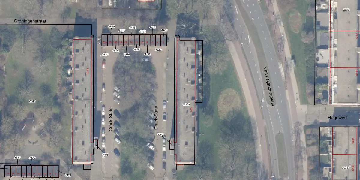 Het perceel waarop Crack-State 13 staat heeft een oppervlakte van 954 m². Dit is een groot perceel. De perceeloppervlakte wordt geregistreerd door het Kadaster. Gedetailleerde informatie over de maten van dit perceel kunt u vinden in het rapport Kadastrale kaart met maatvoering van Crack-State 13.