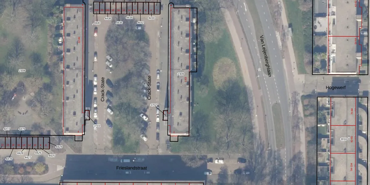 Het perceel waarop Crack-State 29 staat heeft een oppervlakte van 954 m². Dit is een groot perceel. De perceeloppervlakte wordt geregistreerd door het Kadaster. Gedetailleerde informatie over de maten van dit perceel kunt u vinden in het rapport Kadastrale kaart met maatvoering van Crack-State 29.