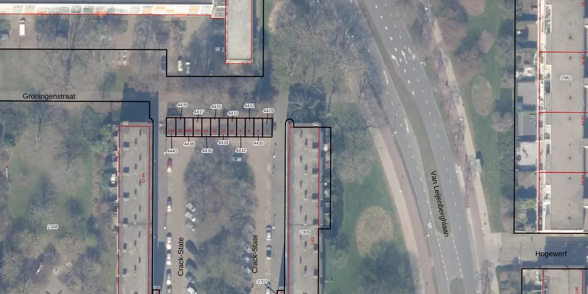 Het perceel waarop Crack-State 3 staat heeft een oppervlakte van 954 m². Dit is een groot perceel. De perceeloppervlakte wordt geregistreerd door het Kadaster. Gedetailleerde informatie over de maten van dit perceel kunt u vinden in het rapport Kadastrale kaart met maatvoering van Crack-State 3.