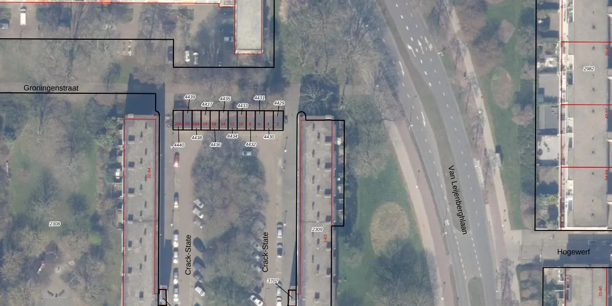 Het perceel waarop Crack-State 5 staat heeft een oppervlakte van 954 m². Dit is een groot perceel. De perceeloppervlakte wordt geregistreerd door het Kadaster. Gedetailleerde informatie over de maten van dit perceel kunt u vinden in het rapport Kadastrale kaart met maatvoering van Crack-State 5.