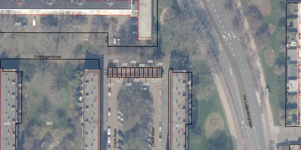 Het perceel waarop Crack-State 6 staat heeft een oppervlakte van 19 m². Dit is een klein perceel. De perceeloppervlakte wordt geregistreerd door het Kadaster. Gedetailleerde informatie over de maten van dit perceel kunt u vinden in het rapport Kadastrale kaart met maatvoering van Crack-State 6.