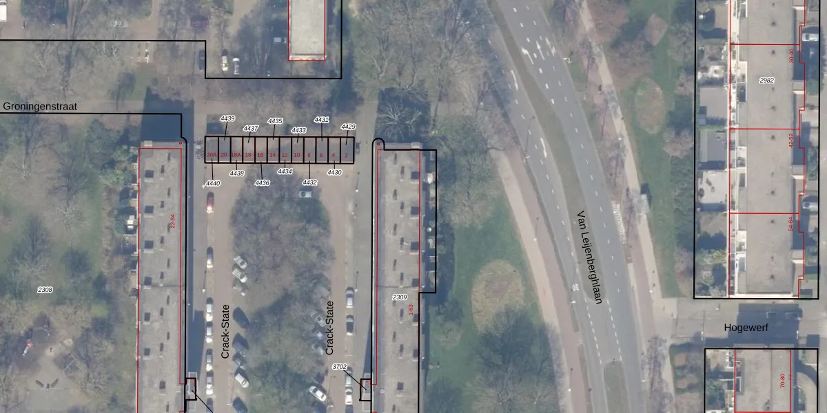 Het perceel waarop Crack-State 63 staat heeft een oppervlakte van 954 m². Dit is een groot perceel. De perceeloppervlakte wordt geregistreerd door het Kadaster. Gedetailleerde informatie over de maten van dit perceel kunt u vinden in het rapport Kadastrale kaart met maatvoering van Crack-State 63.