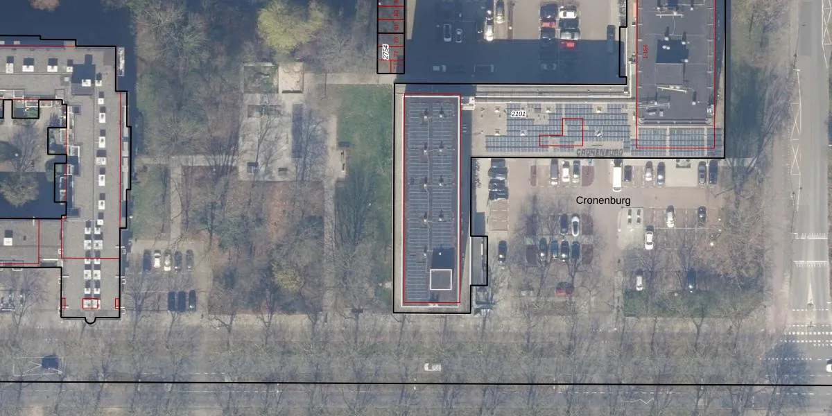 Het perceel waarop Cronenburg 13 staat heeft een oppervlakte van 2815 m². Dit is een zeer groot perceel. De perceeloppervlakte wordt geregistreerd door het Kadaster. Gedetailleerde informatie over de maten van dit perceel kunt u vinden in het rapport Kadastrale kaart met maatvoering van Cronenburg 13.