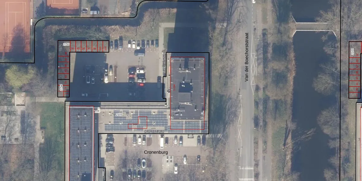Het perceel waarop Cronenburg 150 staat heeft een oppervlakte van 2815 m². Dit is een zeer groot perceel. De perceeloppervlakte wordt geregistreerd door het Kadaster. Gedetailleerde informatie over de maten van dit perceel kunt u vinden in het rapport Kadastrale kaart met maatvoering van Cronenburg 150.