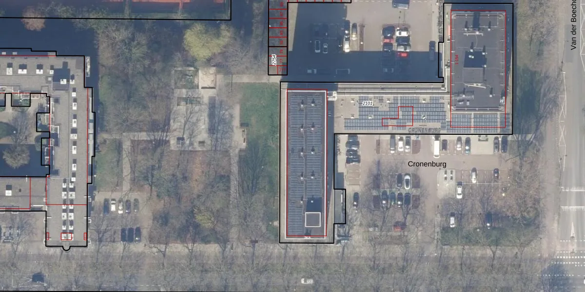 Het perceel waarop Cronenburg 55 staat heeft een oppervlakte van 2815 m². Dit is een zeer groot perceel. De perceeloppervlakte wordt geregistreerd door het Kadaster. Gedetailleerde informatie over de maten van dit perceel kunt u vinden in het rapport Kadastrale kaart met maatvoering van Cronenburg 55.