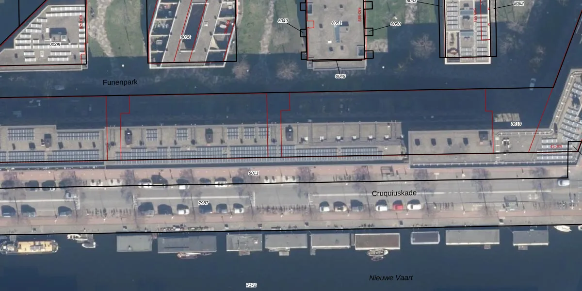 Het perceel waarop Cruquiuskade 183 staat heeft een oppervlakte van 8973 m². Dit is een zeer groot perceel. De perceeloppervlakte wordt geregistreerd door het Kadaster. Gedetailleerde informatie over de maten van dit perceel kunt u vinden in het rapport Kadastrale kaart met maatvoering van Cruquiuskade 183.