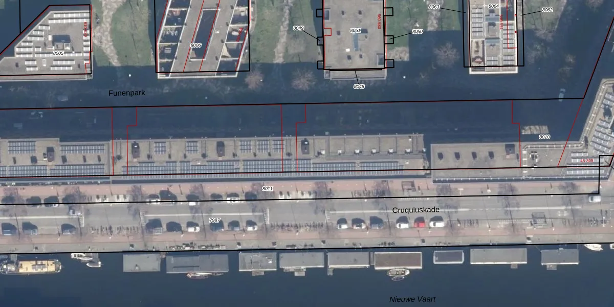 Het perceel waarop Cruquiuskade 197 staat heeft een oppervlakte van 8973 m². Dit is een zeer groot perceel. De perceeloppervlakte wordt geregistreerd door het Kadaster. Gedetailleerde informatie over de maten van dit perceel kunt u vinden in het rapport Kadastrale kaart met maatvoering van Cruquiuskade 197.
