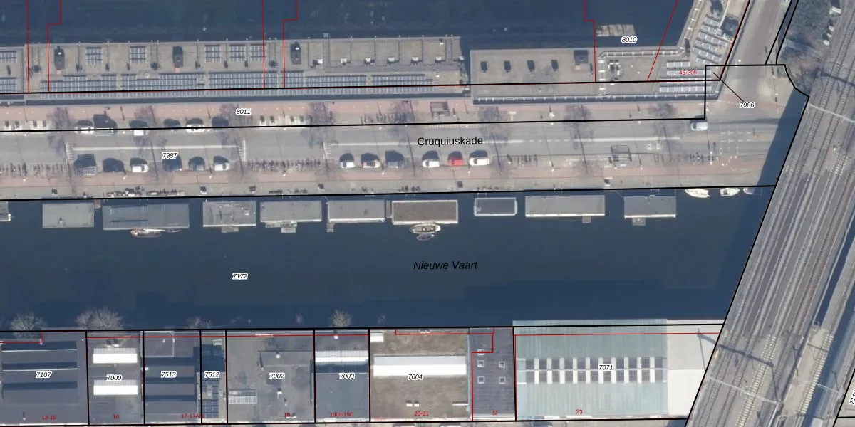 Cruquiuskade 38 is gelegen op kadastraal perceel ASD02A7172. Deze kadastrale aanduiding is uniek en wordt gebruikt door het Kadaster om eigendomsrechten en andere zakelijke rechten vast te leggen. Het perceel maakt onderdeel uit van de kadastrale gemeente Amsterdam.
