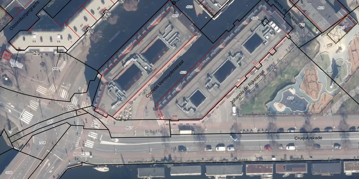 Cruquiuskade 9 is gelegen op kadastraal perceel ASD10N4519. Deze kadastrale aanduiding is uniek en wordt gebruikt door het Kadaster om eigendomsrechten en andere zakelijke rechten vast te leggen. Het perceel maakt onderdeel uit van de kadastrale gemeente Amsterdam.