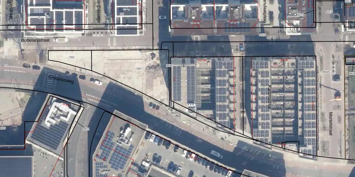 Het perceel waarop het adres ligt is ASD02-A-8647. De afkorting 'ASD02' staat voor kadastrale gemeente Amsterdam. Het perceel is 1402 m² groot. Dat is kleiner dan de gemiddelde perceeloppervlakte in Amsterdam, dat op 2763,93 m² ligt. Het kleinste perceel in de kadastrale gemeente is 0 m² groot. De grootste perceeloppervlakte is 14,3 ha. Op het perceel zijn 63 adressen aanwezig. In de Basisregistratie Kadaster (BRK) werden de grenzen van het perceel geregistreerd op 25-06-2025.