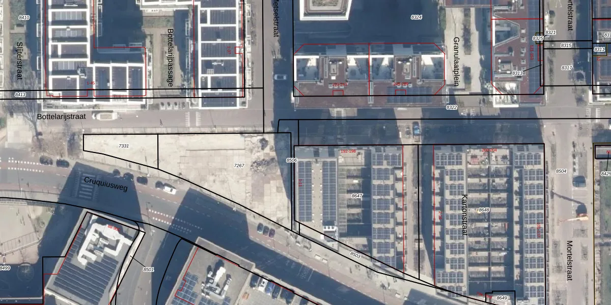 Het perceel waarop het adres ligt is ASD02-A-8647. De afkorting 'ASD02' staat voor kadastrale gemeente Amsterdam. Het perceel is 1402 m² groot. Dat is kleiner dan de gemiddelde perceeloppervlakte in Amsterdam, dat op 2763,93 m² ligt. Het kleinste perceel in de kadastrale gemeente is 0 m² groot. De grootste perceeloppervlakte is 14,3 ha. Op het perceel liggen in totaal 63 adressen. De huidige grenzen van het perceel zijn digitaal in de Basisregistratie Kadaster (BRK) geregistreerd op 25-06-2025.