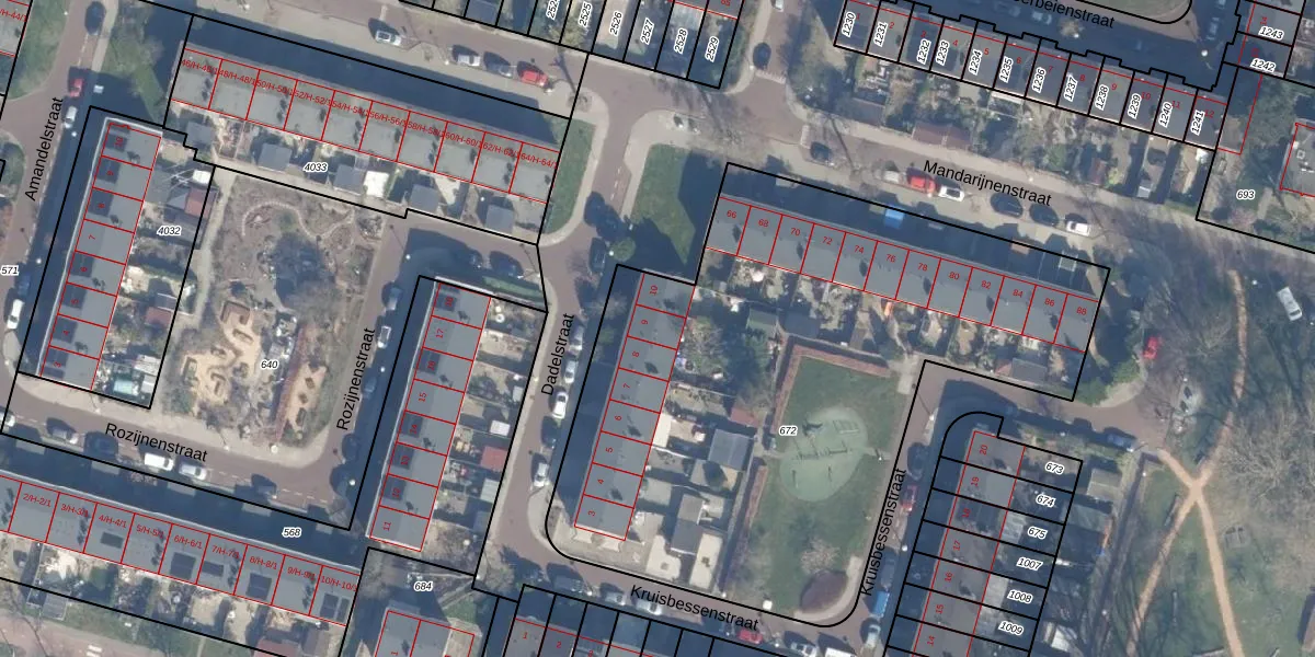 Het perceel waarop Dadelstraat 9 staat heeft een oppervlakte van 3388 m². Dit is een zeer groot perceel. De perceeloppervlakte wordt geregistreerd door het Kadaster. Gedetailleerde informatie over de maten van dit perceel kunt u vinden in het rapport Kadastrale kaart met maatvoering van Dadelstraat 9.