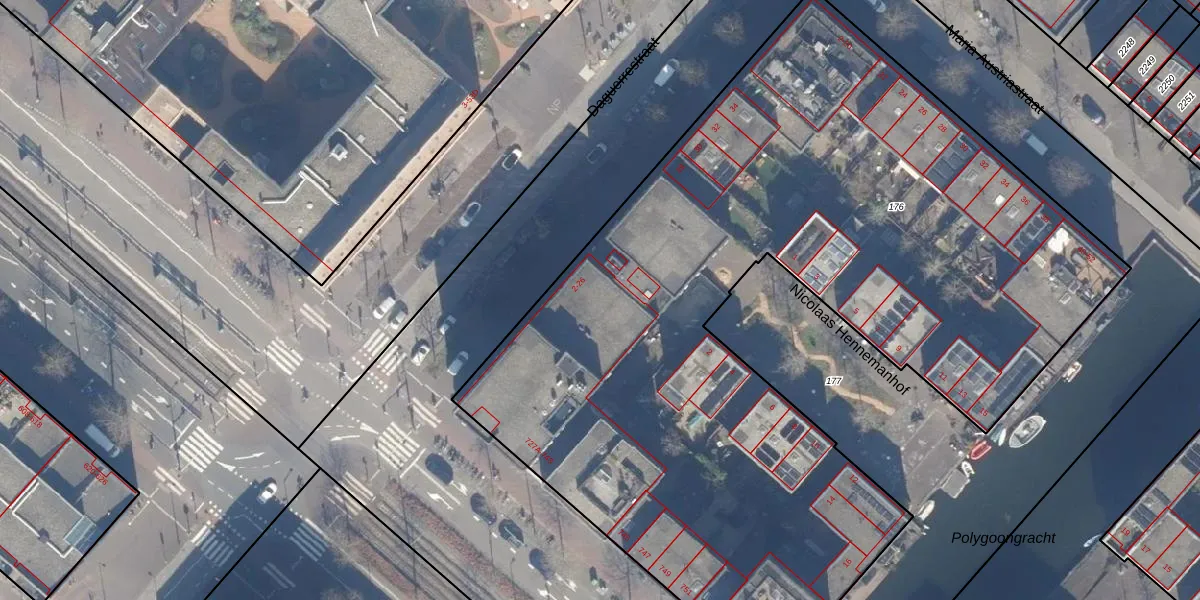 Het adres is gelegen op perceel 176 in de sectie AU en de kadastrale gemeente Amsterdam. De kadastrale aanduiding is aldus ASD41-AU-176. Het perceel is 5638 m² groot. Dat is kleiner dan de gemiddelde perceeloppervlakte in Amsterdam, dat op 7285,32 m² ligt. De grootste perceeloppervlakte in de kadastrale gemeente is 2,75 km². De kleinste oppervlakte bedraagt 0 m². Op het perceel zijn 88 adressen aanwezig. De huidige grenzen van het perceel zijn digitaal in de Basisregistratie Kadaster (BRK) geregistreerd op 19-02-2003.