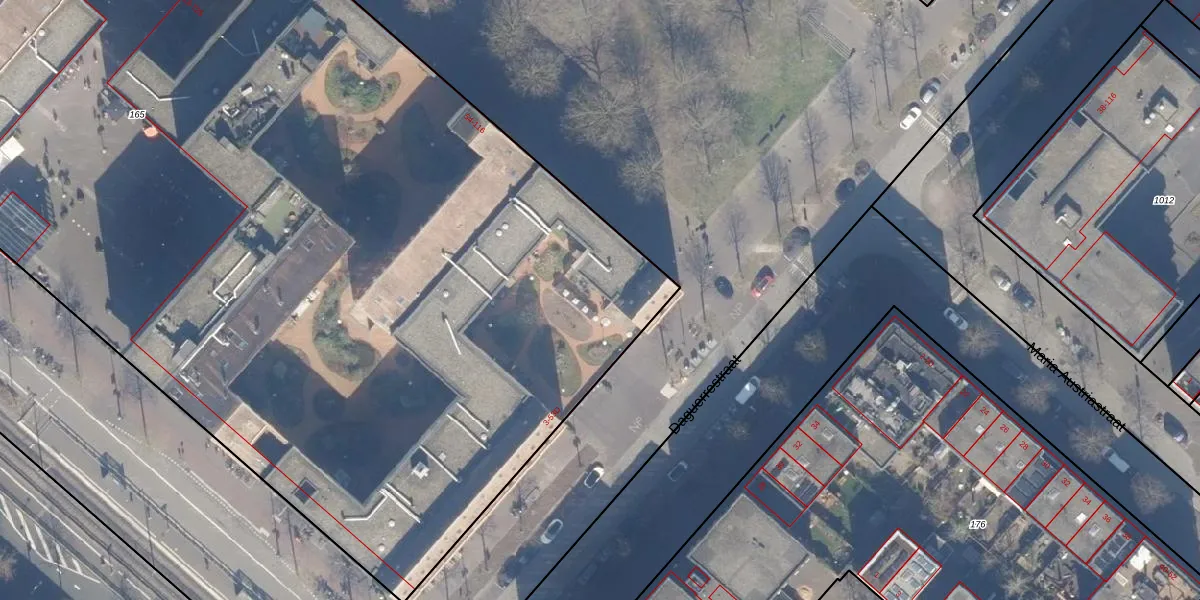Het perceel waarop Daguerrestraat 53-M staat heeft een oppervlakte van 1,2 ha. Dit is een zeer groot perceel. De perceeloppervlakte wordt geregistreerd door het Kadaster. Gedetailleerde informatie over de maten van dit perceel kunt u vinden in het rapport Kadastrale kaart met maatvoering van Daguerrestraat 53-M.
