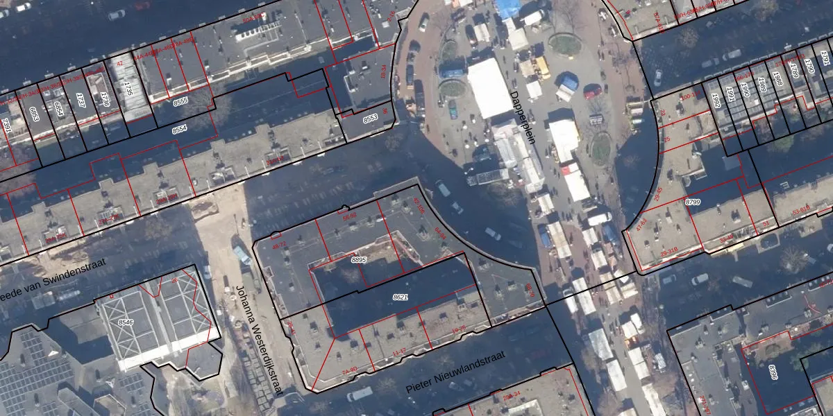 Het perceel waarop Dapperplein 44 staat heeft een oppervlakte van 1085 m². Dit is een zeer groot perceel. De perceeloppervlakte wordt geregistreerd door het Kadaster. Gedetailleerde informatie over de maten van dit perceel kunt u vinden in het rapport Kadastrale kaart met maatvoering van Dapperplein 44.