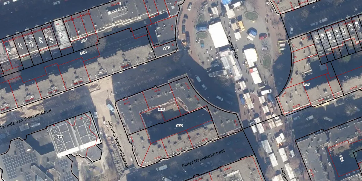 Het perceel waarop Dapperplein 56 staat heeft een oppervlakte van 1085 m². Dit is een zeer groot perceel. De perceeloppervlakte wordt geregistreerd door het Kadaster. Gedetailleerde informatie over de maten van dit perceel kunt u vinden in het rapport Kadastrale kaart met maatvoering van Dapperplein 56.