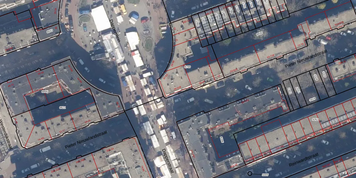 Het perceel waarop Dapperplein 63 staat heeft een oppervlakte van 981 m². Dit is een groot perceel. De perceeloppervlakte wordt geregistreerd door het Kadaster. Gedetailleerde informatie over de maten van dit perceel kunt u vinden in het rapport Kadastrale kaart met maatvoering van Dapperplein 63.