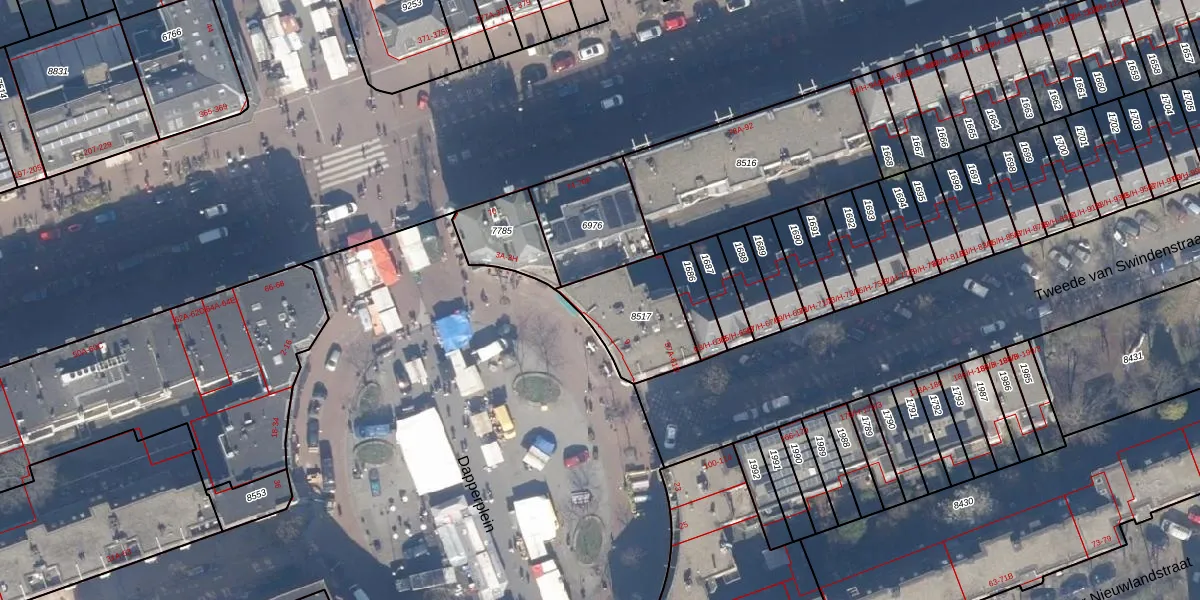 Het perceel waarop Dapperplein 7 staat heeft een oppervlakte van 280 m². Dit is een middelgroot perceel. De perceeloppervlakte wordt geregistreerd door het Kadaster. Gedetailleerde informatie over de maten van dit perceel kunt u vinden in het rapport Kadastrale kaart met maatvoering van Dapperplein 7.