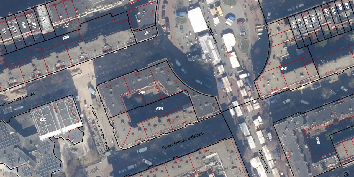 Het perceel waarop Dapperplein 74 staat heeft een oppervlakte van 1085 m². Dit is een zeer groot perceel. De perceeloppervlakte wordt geregistreerd door het Kadaster. Gedetailleerde informatie over de maten van dit perceel kunt u vinden in het rapport Kadastrale kaart met maatvoering van Dapperplein 74.