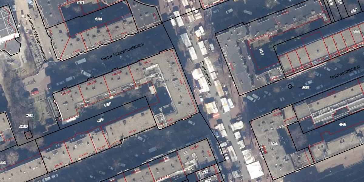 Het perceel waarop Dapperstraat 80-F staat heeft een oppervlakte van 1907 m². Dit is een zeer groot perceel. De perceeloppervlakte wordt geregistreerd door het Kadaster. Gedetailleerde informatie over de maten van dit perceel kunt u vinden in het rapport Kadastrale kaart met maatvoering van Dapperstraat 80-F.