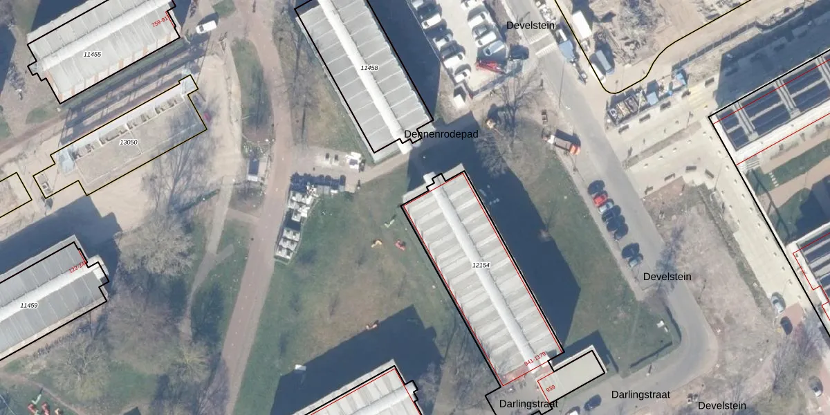 Het perceel waarop Darlingstraat 1057 staat heeft een oppervlakte van 1110 m². Dit is een zeer groot perceel. De perceeloppervlakte wordt geregistreerd door het Kadaster. Gedetailleerde informatie over de maten van dit perceel kunt u vinden in het rapport Kadastrale kaart met maatvoering van Darlingstraat 1057.