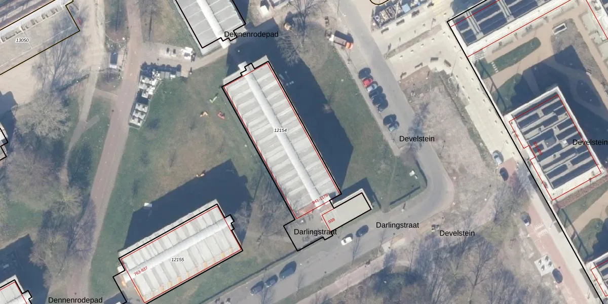 Het perceel waarop Darlingstraat 1079 staat heeft een oppervlakte van 1110 m². Dit is een zeer groot perceel. De perceeloppervlakte wordt geregistreerd door het Kadaster. Gedetailleerde informatie over de maten van dit perceel kunt u vinden in het rapport Kadastrale kaart met maatvoering van Darlingstraat 1079.