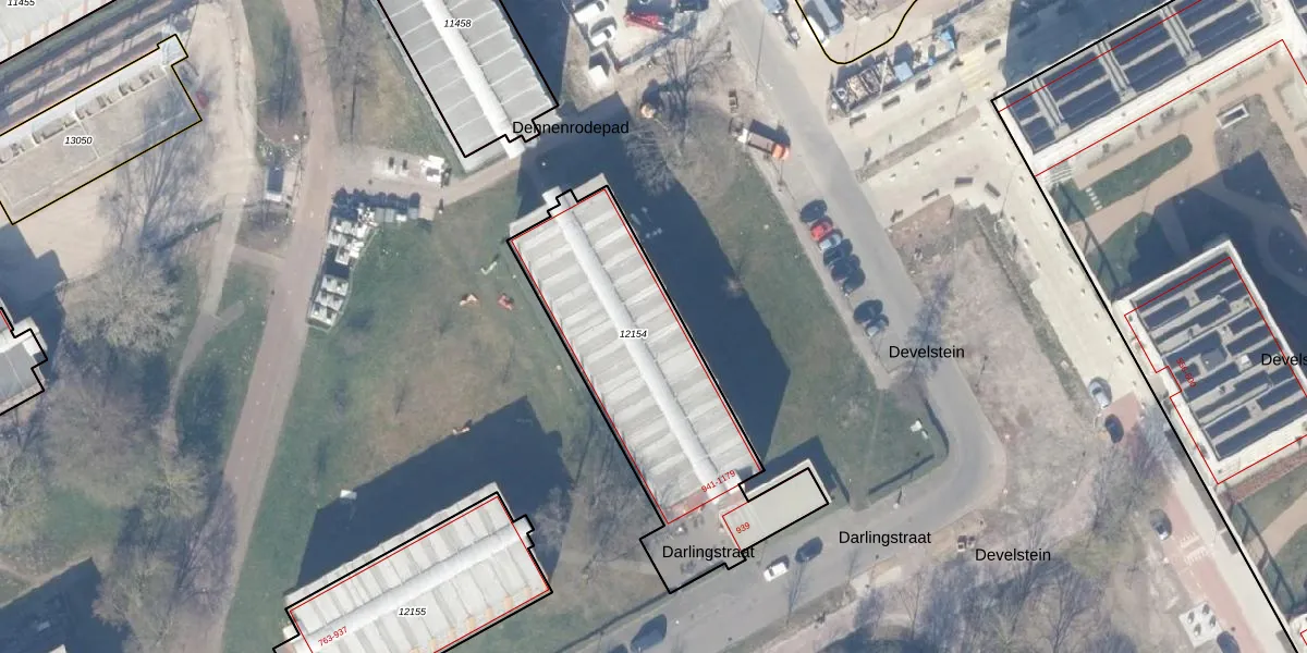 Het perceel waarop Darlingstraat 1091 staat heeft een oppervlakte van 1110 m². Dit is een zeer groot perceel. De perceeloppervlakte wordt geregistreerd door het Kadaster. Gedetailleerde informatie over de maten van dit perceel kunt u vinden in het rapport Kadastrale kaart met maatvoering van Darlingstraat 1091.