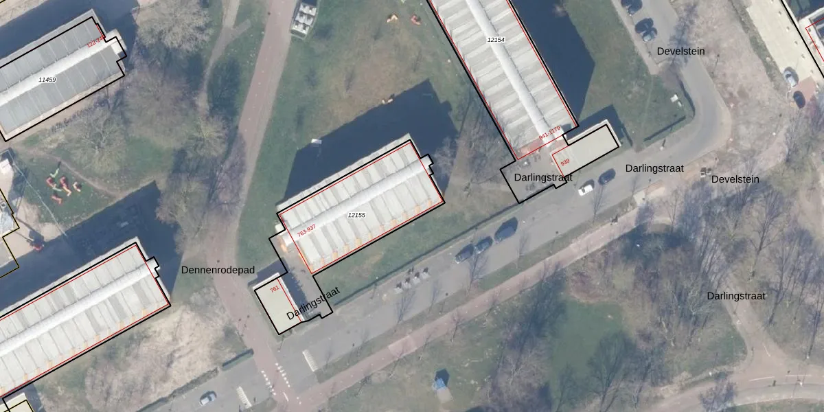 Het perceel waarop Darlingstraat 933 staat heeft een oppervlakte van 875 m². Dit is een groot perceel. De perceeloppervlakte wordt geregistreerd door het Kadaster. Gedetailleerde informatie over de maten van dit perceel kunt u vinden in het rapport Kadastrale kaart met maatvoering van Darlingstraat 933.