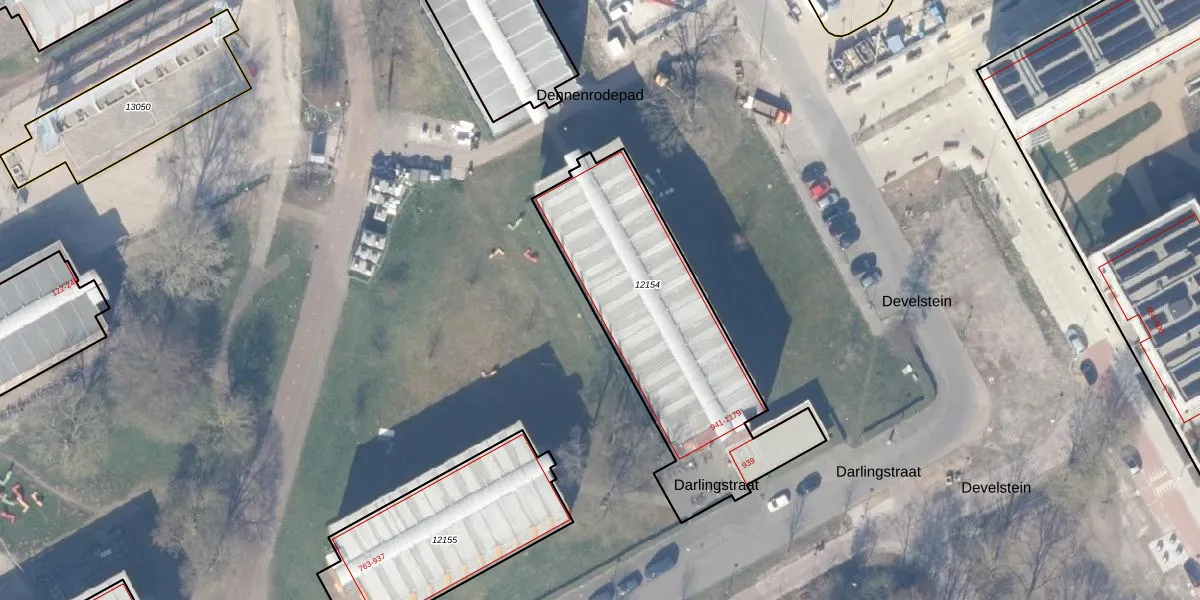 Het perceel waarop Darlingstraat 973 staat heeft een oppervlakte van 1110 m². Dit is een zeer groot perceel. De perceeloppervlakte wordt geregistreerd door het Kadaster. Gedetailleerde informatie over de maten van dit perceel kunt u vinden in het rapport Kadastrale kaart met maatvoering van Darlingstraat 973.