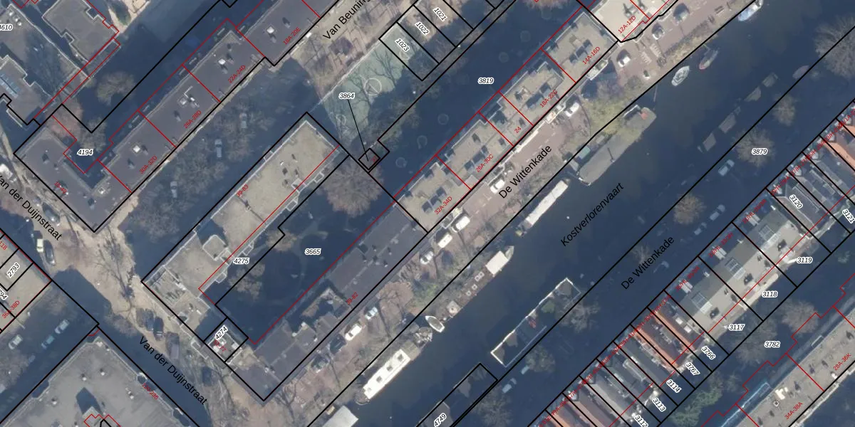 Het perceel waarop De Wittenkade 34-A staat heeft een oppervlakte van 1495 m². Dit is een zeer groot perceel. De perceeloppervlakte wordt geregistreerd door het Kadaster. Gedetailleerde informatie over de maten van dit perceel kunt u vinden in het rapport Kadastrale kaart met maatvoering van De Wittenkade 34-A.