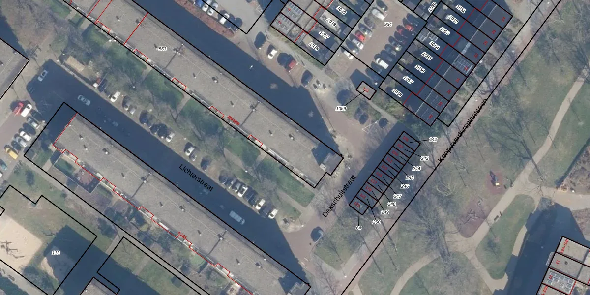 Het perceel waarop Dekschuitstraat 164 staat heeft een oppervlakte van 2283 m². Dit is een zeer groot perceel. De perceeloppervlakte wordt geregistreerd door het Kadaster. Gedetailleerde informatie over de maten van dit perceel kunt u vinden in het rapport Kadastrale kaart met maatvoering van Dekschuitstraat 164.