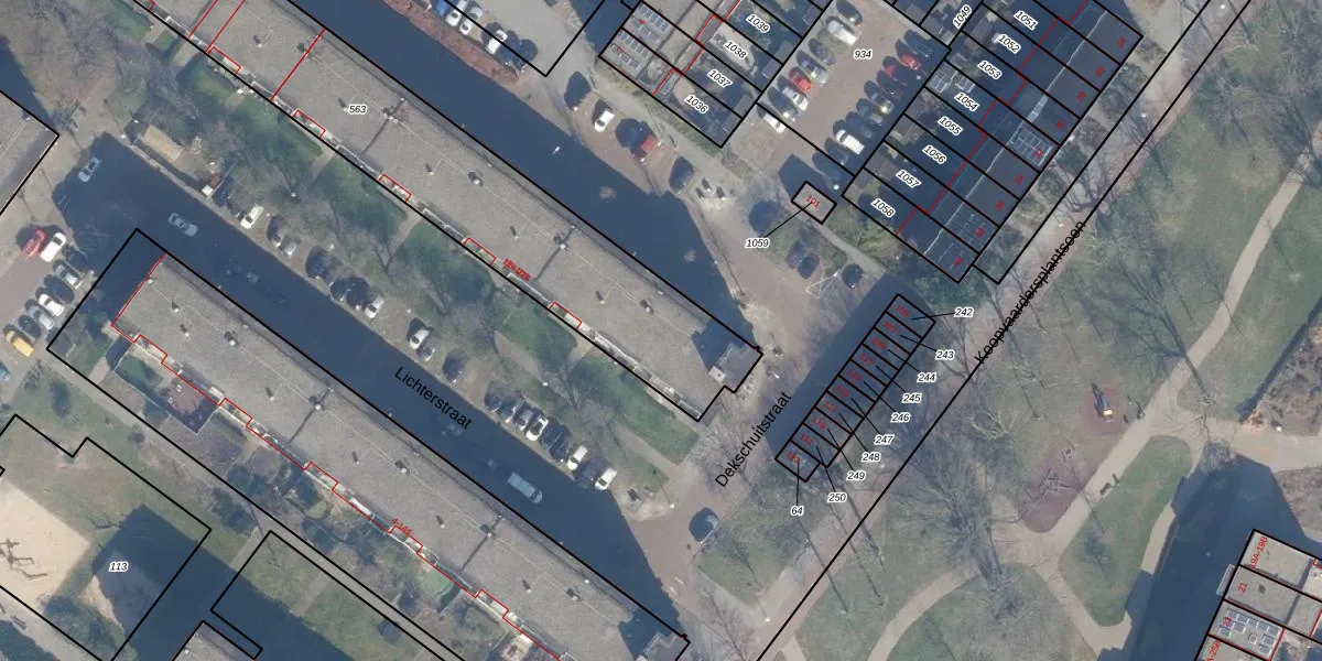 Het perceel waarop Dekschuitstraat 166 staat heeft een oppervlakte van 2283 m². Dit is een zeer groot perceel. De perceeloppervlakte wordt geregistreerd door het Kadaster. Gedetailleerde informatie over de maten van dit perceel kunt u vinden in het rapport Kadastrale kaart met maatvoering van Dekschuitstraat 166.