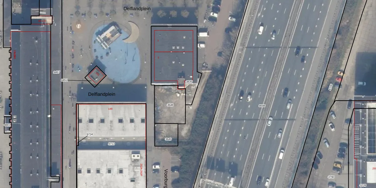 Het perceel waarop Delflandplein 13 staat heeft een oppervlakte van 837 m². Dit is een groot perceel. De perceeloppervlakte wordt geregistreerd door het Kadaster. Gedetailleerde informatie over de maten van dit perceel kunt u vinden in het rapport Kadastrale kaart met maatvoering van Delflandplein 13.