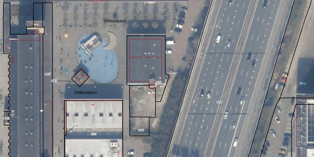 Het perceel waarop Delflandplein 39 staat heeft een oppervlakte van 837 m². Dit is een groot perceel. De perceeloppervlakte wordt geregistreerd door het Kadaster. Gedetailleerde informatie over de maten van dit perceel kunt u vinden in het rapport Kadastrale kaart met maatvoering van Delflandplein 39.