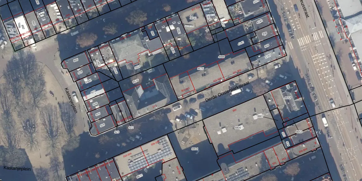 Het perceel waarop Derde Oosterparkstraat 305 staat heeft een oppervlakte van 973 m². Dit is een groot perceel. De perceeloppervlakte wordt geregistreerd door het Kadaster. Gedetailleerde informatie over de maten van dit perceel kunt u vinden in het rapport Kadastrale kaart met maatvoering van Derde Oosterparkstraat 305.