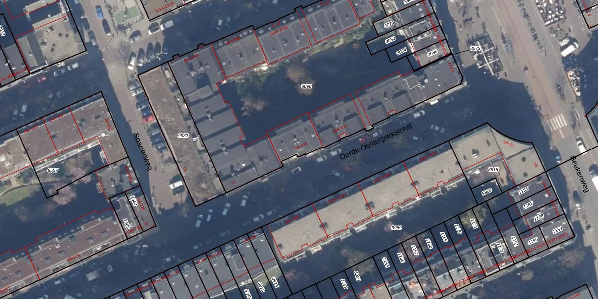 Het perceel waarop Derde Oosterparkstraat 81-A staat heeft een oppervlakte van 3448 m². Dit is een zeer groot perceel. De perceeloppervlakte wordt geregistreerd door het Kadaster. Gedetailleerde informatie over de maten van dit perceel kunt u vinden in het rapport Kadastrale kaart met maatvoering van Derde Oosterparkstraat 81-A.